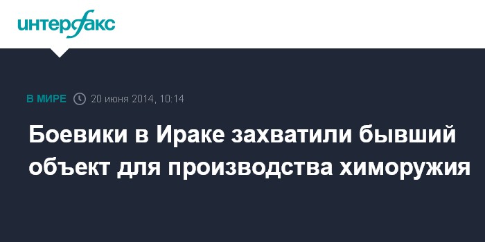 Москва. 20 июня. INTERFAX.RU - Боевики группировки "Исламское государство Ирака и Леванта" установили контроль над комплексом Мусанна в Ираке, использовавшимся для создания химического оружия при Саддаме Хусейне, сообщают западные СМИ.