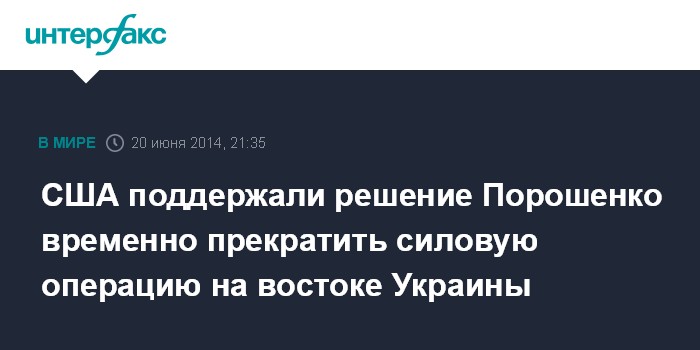 "США поддерживают усилия Порошенко по установлению мира и единства на Украине. Президент Петр Порошенко с момента вступления в эту должность ясно дал понять, что он привержен поиску мирного решения кризиса", - сказал Эрнст, комментируя решение президента Украины о перемирии.