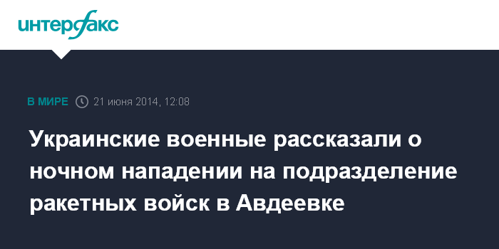 Москва. 21 июня. INTERFAX.RU - Украинские военные в ночь на субботу успешно отразили два нападения на одно из подразделений зенитного ракетного полка Воздушных сил Украины в поселке Авдеевка Донецкой области, сообщает управление прессы и информации Минобороны страны.