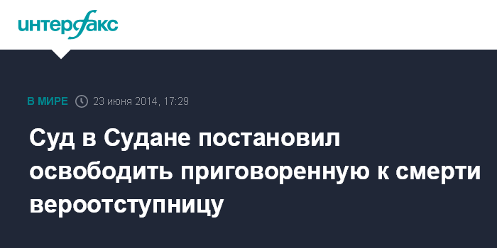 Москва. 23 июня. INTERFAX.RU - Апелляционный суд в Судане постановил отменить смертный приговор и отпустить Мериам Ибрагим, которую ранее приговорили к смерти за отступничество от ислама. Об этом сообщает Sky News со ссылкой на государственное информационное агентство Судана - SUNA.