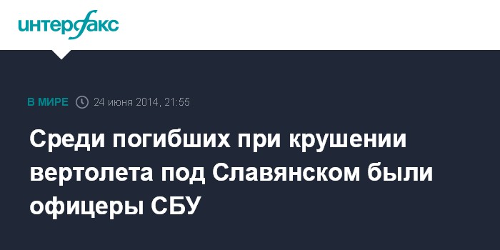 Москва. 24 июня. INTERFAX.RU - Среди погибших в результате крушения вертолета Ми-8 на Украине были офицеры СБУ, заявил в эфире "5 канала" врио начальника управления по работе с личным составом Вооруженных сил Украины Александр Розмазнин.