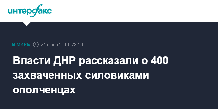 Москва. 24 июня. INTERFAX.RU - Первый вице-премьер самопровозглашенной Донецкой народной республики (ДНР) Андрей Пургин заявил, что в руках украинских силовиков находятся более 400 человек, захваченных на территории ДНР.