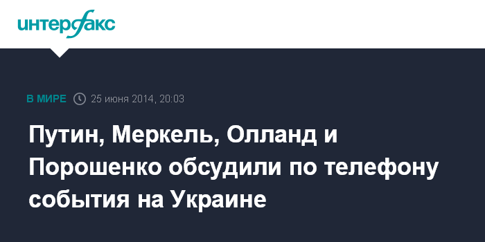 Москва. 25 июня. INTERFAX.RU - Лидеры России, Франции, ФРГ и Украины в среду обсудили по телефону украинский кризис и пути выхода из него. В ходе разговора был сделан акцент на необходимости сохранения перемирия на юго-востоке Украины, сообщили в Кремле.