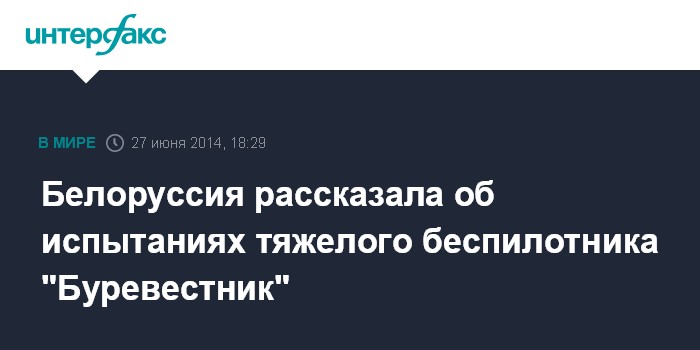 Москва. 27 июня. INTERFAX.RU - Государственные испытания белорусского комплекса с беспилотным летательным аппаратом тяжелого класса "Буревестник" планируется завершить к концу 2014 года, сообщил "Интерфаксу" представитель физико-технического института Национальной академии наук Белоруссии Юрий Яцына.