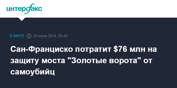 Москва. 28 июня. INTERFAX.RU - Власти Сан-Франциско получат 76 миллионов долларов на строительство вдоль легендарного моста "Золотые ворота" специальной сетки, которая должна помешать потенциальным самоубийцам. Об этом сообщает CNN.