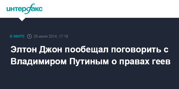 "Я увижусь с Путиным и поговорю об этом (о правах сексуальных меньшинств - ИФ), но не знаю, что хорошего из этого выйдет", - заявил Элтон Джон в интервью Sky News.
