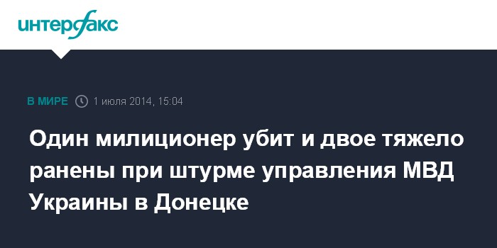 Москва. 1 июля. INTERFAX.RU - В ходе начавшегося во вторник штурма здания областного управления милиции в Донецке погиб один сотрудник правоохранительных органов, еще двое получили тяжелые ранения, сообщили в МВД Украины.