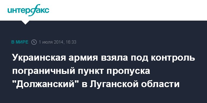 Москва. 1 июля. INTERFAX.RU - Украинские силовики во вторник восстановили контроль над пунктом пропуска "Должанский" на границе с Россией в Луганской области, сообщил "Интерфаксу" источник в силовых структурах. "Мы возобновили контроль в пункте пропуска "Должанский", - сказал собеседник агентства.