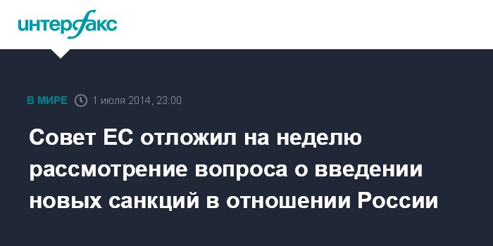 Москва. 1 июля. INTERFAX.RU - Европейский союз отложил на неделю рассмотрение вопроса относительно введения новых санкций в отношении России в связи с украинским кризисом, сообщили "Интерфаксу" во вторник вечером во внешнеполитической службе ЕС.