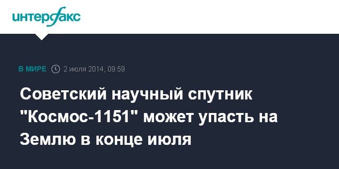 Москва. 2 июля. INTERFAX.RU - Отработавший советский спутник дистанционного зондирования Земли "Космос-1151" (его другое название - "Океан-Е2", по международному каталогу его номер - 1980-005А), запускавшийся по программе исследований Мирового океана, может упасть на Землю в конце третьей декады июля, прогнозирует американская Система контроля космического пространства.