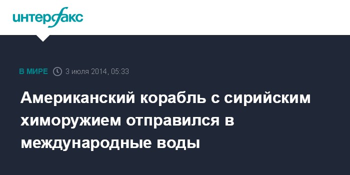 Москва. 3 июля. INTERFAX.RU - Американский корабль "Кейп Рэй" с сирийским химическим оружием на борту покинул итальянский порт Джоя-Тауро и отправился в международные воды, сообщил Пентагон.
