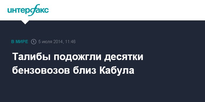 Москва. 5 июля. INTERFAX.RU - Мятежники из движения "Талибан" в ночь на субботу подожгли несколько десятков бензовозов недалеко от Кабула, передают западные СМИ со ссылкой на афганскую полицию.
