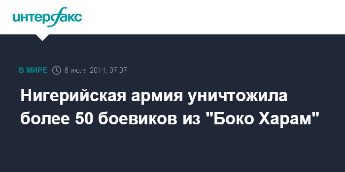 Москва. 6 июля. INTERFAX.RU - Нигерийские вооруженные силы объявили о ликвидации нескольких десятков боевиков исламистской группировки "Боко Харам" во время отражения атаки на военную базу на северо-востоке страны, сообщил телеканал "Аль-Джазира".