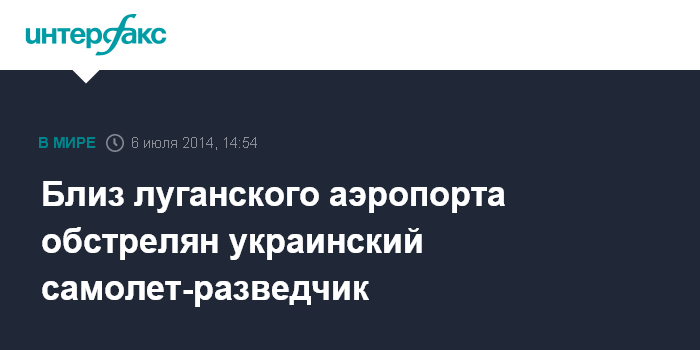 Москва. 6 июля. INTERFAX.RU - Представители самопровозглашенной "Луганской народной республики" (ЛНР) открыли огонь из ручного автоматического оружия по самолету Вооруженных сил Украины, который в воскресенье проводил разведку местности в районе луганского аэропорта. Как передает корреспондент "Интерфакса", инцидент произошел около 11:00 по местному времени. После непродолжительной стрельбы самолет покинул зону обстрела без видимых повреждений.