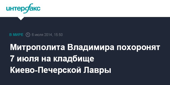 Москва. 6 июля. INTERFAX.RU - Главу Украинской православной церкви (Московского патриархата) митрополита Киевского и всея Украины Владимира (Сабодана) похоронят в понедельник, 7 июля, на братском кладбище Киево-Печерской Лавры возле храма Рождества Богородицы. Об этом говорится в журналах Священного синода УПЦ (МП), заседание которого проходило в воскресенье в резиденции предстоятеля в Лавре.