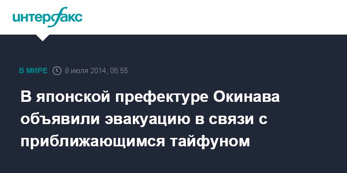 Москва. 8 июля. INTERFAX.RU - Эвакуация почти 300 тысяч человек объявлена в японской префектуре Окинава в связи с приближающимся мощным тайфуном "Ногури", сообщает телеканал NHK.