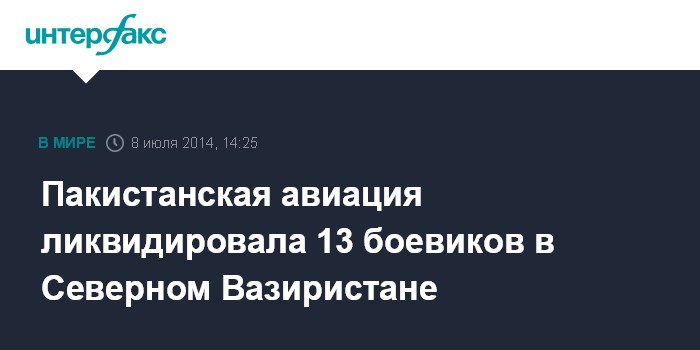 Москва. 8 июля. INTERFAX.RU - По меньшей мере, 13 боевиков уничтожены в результате серии авиаударов, которые ВВС Пакистана нанесли в регионе Северный Вазиристан близ границы с Афганистаном, сообщает во вторник интернет-портал ливанского издания "Дейли стар".