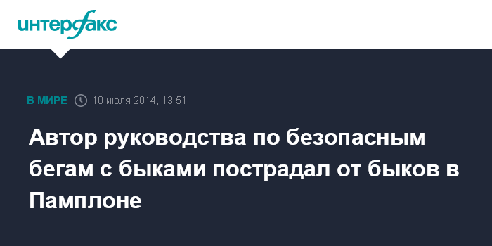Москва. 10 июля. INTERFAX.RU - Соавтор руководства о безопасных бегах с быками получил серьезную травму во время традиционного забега с этими животными в испанском городе Памплона, сообщает The Guardian со ссылкой на власти автономной области Наварра, где находится Памплона.