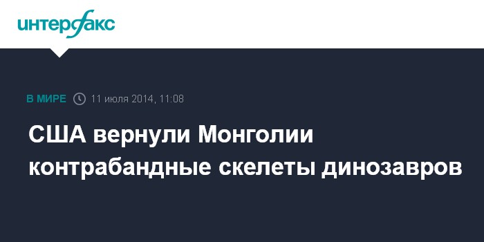 Москва. 11 июля. INTERFAX.RU - Власти США передали Монголии ископаемые останки более 18 динозавров, которые ранее были вывезены из страны контрабандным путем, сообщает американская газета New York Post.