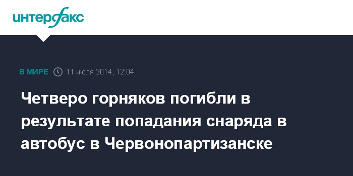 Москва. 11 июля. INTERFAX.RU - В результате попадания в четверг артиллерийского снаряда в автобус, перевозивший горняков Донбасской топливно-энергетической компании "Шахтоуправление "Червонопартизанское", погибли четверо горняков, еще 16 ранены, сообщил генеральный директор ДТЭК Максим Тимченко.