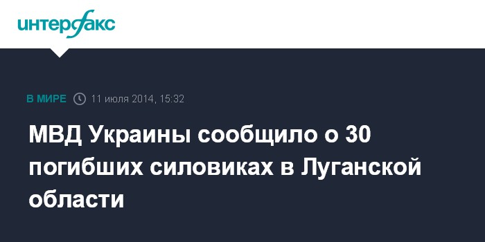 Москва. 11 июля. INTERFAX.RU - В результате обстрела подразделений украинских сил в районе поселка Зеленополье Свердловского района Луганской области утром 11 июля погибли около 30 человек, сообщил советник главы МВД Украины Зорян Шкиряк.