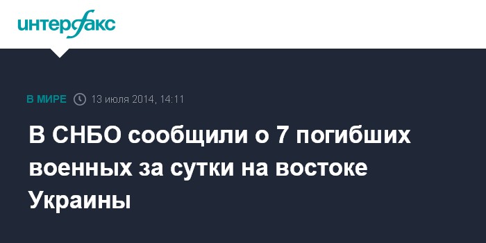 Москва. 13 июля. INTERFAX.RU - За минувшие сутки в зоне проведения операции на востоке Украины погибли семь военных, 30 получили ранения, заявил спикер информационно-аналитического центра СНБО Андрей Лысенко на брифинге в Киеве в воскресенье.