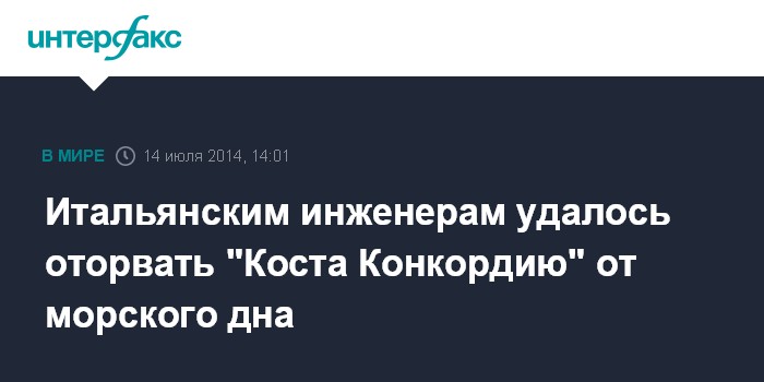 Москва. 14 июля. INTERFAX.RU - Команде инженеров, участвующих в операции по подъему на воду затонувшего круизного лайнера "Коста Конкордия", удалось оторвать судно от специальной платформы, закрепленной на морском дне, передает в понедельник итальянское телевидение.