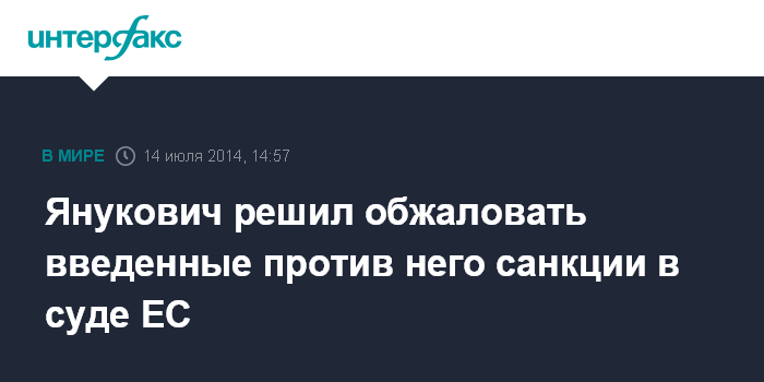 Москва. 14 июля. INTERFAX.RU - Бывший президент Украины Виктор Янукович направил в суд Европейского союза иск, в котором потребовал отменить действие санкций, введенных Брюсселем в отношении него и его сыновей, заявили в понедельник в этой судебной инстанции.