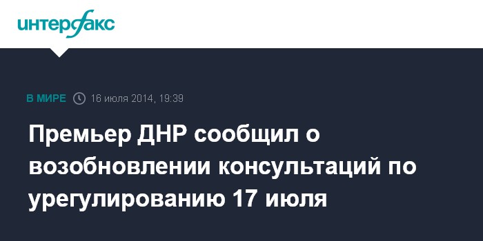 Москва. 16 июля. INTERFAX.RU - Очередной раунд консультаций контактной группы по мирному урегулированию на востоке Украины состоится в четверг, в 18:00 по киевскому времени (19:00 по Москве) в режиме телемоста. В нем примут участие представители правительства самопровозглашенной Донецкой народной республики, сообщил премьер ДНР Александр Бородай.