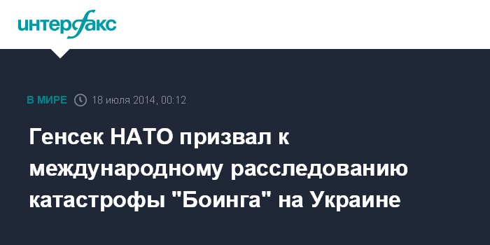 Москва. 18 июля. INTERFAX.RU - Генеральный секретарь НАТО Андерс Фог Расмуссен заявил о необходимости полного международного расследования авиакатастрофы малазийского авиалайнера в Донецкой области Украины.