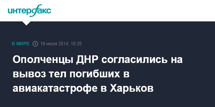 Москва. 18 июля. INTERFAX.RU - Ополченцы Донецкой народной республики готовы дать согласие на вывоз тел погибших в результате крушения "Боинга-777" в Харьков, где находится украинский штаб по расследованию катастрофы. Об этом заявил журналистам в пятницу премьер-министр ДНР Александр Бородай.