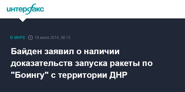 Москва. 19 июля. INTERFAX.RU - У США имеются "четкие доказательства" того, что по "Боингу 777" авиакомпании Malaysian Airlines была запущена ракета с территории, которую контролирует самопровозглашенная Донецкая народная республика. Об этом, как сообщает пресс-служба украинского президента, заявил вице-президент американского государства Джозеф Байден в телефонном разговоре с Петром Порошенко.