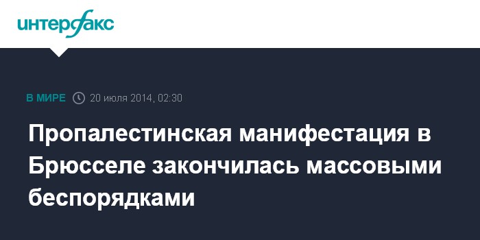 Москва. 20 июля. INTERFAX.RU - Прошедшая в субботу в Брюсселе манифестация в поддержку народа Палестины, начавшись спокойно, переросла в массовые беспорядки.