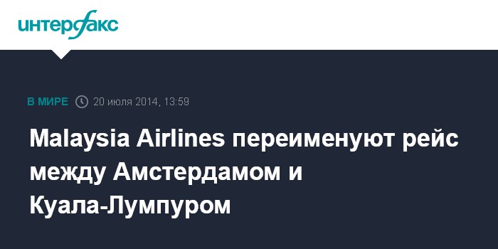 Москва. 20 июля. INTERFAX.RU - Malaysia Airlines переименуют рейс Амстердам-Куала-Лумпур в связи с авиакатастрофой "Боинга 777" на Украине, сообщает пресс-служба авиакомпании. Рейс Амстердам (AMS) - Куала-Лумпур (KUL) вместо MH17 будет обозначаться MH19 - AMS/KUL.