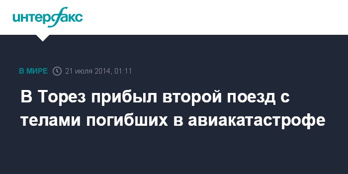 Москва. 21 июля. INTERFAX.RU - Второй поезд с четырьмя вагонами-рефрижераторами для транспортировки тел погибших пассажиров авиалайнера "Боинг-777" компании Malaysia Airlines прибыл в город Торез, сообщает государственная комиссия по расследованию катастрофы самолета.