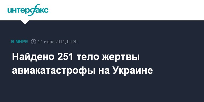 Москва. 21 июля. INTERFAX.RU - За время поисково-спасательных работ на месте крушения авиалайнера "Боинг-777-200" в Шахтерском районе Донецкой области обнаружены тела 251 погибшего и 66 фрагментов тел, сообщает пресс-служба ГСЧС Украины.