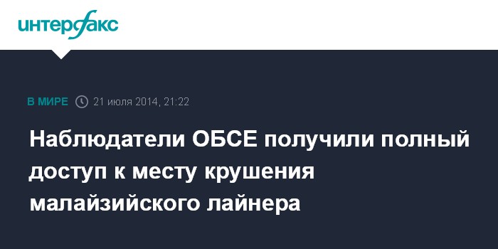 Москва. 21 июля. INTERFAX.RU - Действующие на востоке Украины ополченцы предоставили наблюдателям ОБСЕ полный доступ к месту крушения пассажирского самолета Malaysia Airlines, говорится в докладе наблюдательной миссии, опубликованном в понедельник.