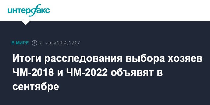 Москва. 21 июля. INTERFAX.RU - FIFA объявит решение относительно результатов расследования выбора мест проведения чемпионатов мира по футболу в 2018 и 2022 годах в сентябре, сообщает официальный сайт организации.