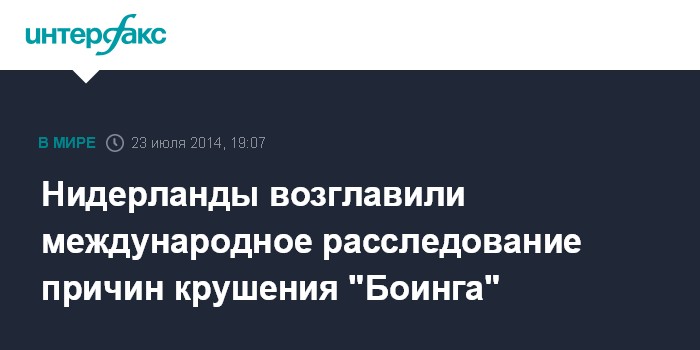 Москва. 23 июля. INTERFAX.RU - В Нидерландском совете по безопасности заявили, что официально берут на себя ответственность за международное расследование обстоятельств крушения пассажирского самолета Malaysia Airlines на востоке Украины, сообщается в пресс-релизе организации.