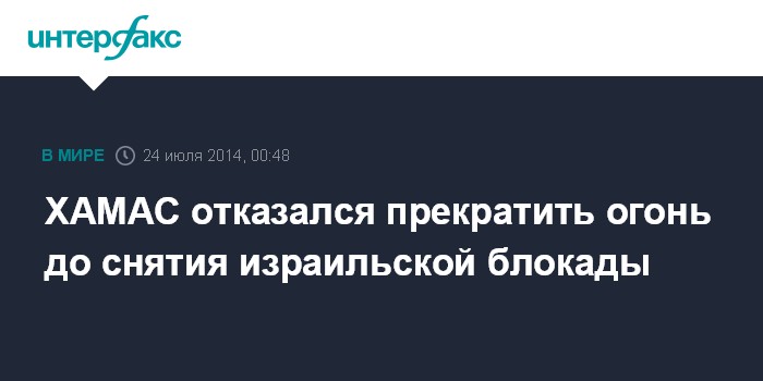 Москва. 24 июля. INTERFAX.RU - Лидер палестинской группировки ХАМАС Халед Машаль, заявил, что отказывается начинать перемирие до тех пор, пока Израиль не закончит блокаду сектора Газа, сообщила BBC News.