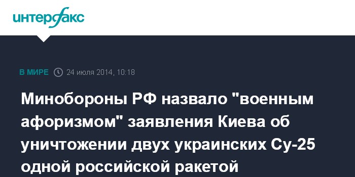 Москва. 24 июля. INTERFAX.RU - В Минобороны России прокомментировали заявление спикера информационного центра СНБО Украины Андрея Лысенко о том, что два украинских Су-25, упавшие в среду в районе поселка Дмитровка Шахтерского района Донецкой области, были сбиты ракетой, запущенной с территории России.