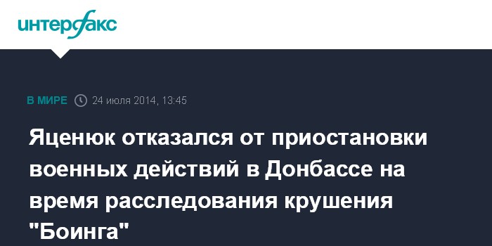 Москва. 24 июля. INTERFAX.RU - Украина не намерена прекращать военную операцию в Донецкой области на время проведения расследования крушения малайзийского авиалайнера, заявил премьер-министр Арсений Яценюк в интервью ВВС.