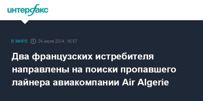 Москва. 24 июля. INTERFAX.RU - Военное командование Франции отправило в воздушное пространство северного Мали два истребителя ВВС для поиска исчезнувшего пассажирского самолета авиакомпании Air Algerie, сообщил в четверг журналистам представитель французской армии Жиль Жарон.