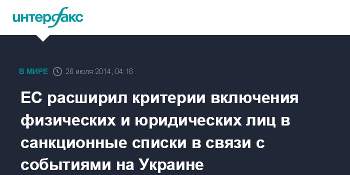 Москва. 26 июля. INTERFAX.RU - Совет ЕС утвердил законодательное предложение, расширяющее правовые критерии включения в санкционные списки для запрета на въезд в ЕС и замораживание европейских активов, публикует "Официальный журнал" ЕС в субботу.
