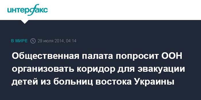 Москва. 29 июля. INTERFAX.RU - Общественная палата (ОП) РФ через МИД передаст в Совет Безопасности ООН обращение с просьбой организовать коридор для вывоза пациентов из зоны боевых действий на юго-востоке Украины, сообщает газета "Коммерсант" во вторник.