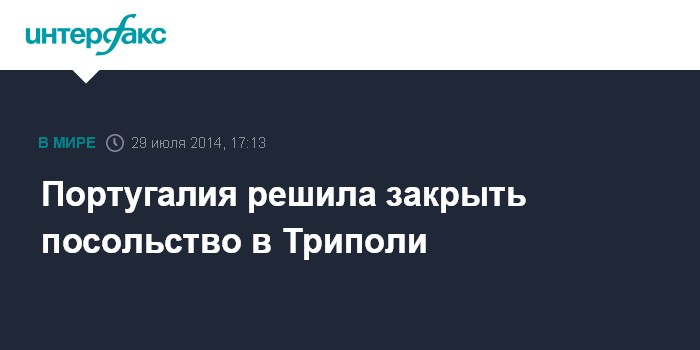 Москва. 29 июля. INTERFAX.RU - Власти Португалии приняли решение временно закрыть посольство в Ливии и эвакуировать всех сотрудников из соображений безопасности, говорится в распространенном во вторник 29 июля коммюнике португальского МИД.
