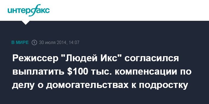 Москва. 30 июля. INTERFAX.RU - Режиссер фильма "Люди Икс" Брайан Сингер согласился выплатить $100 тыс. компенсации по делу о сексуальных домогательствах к подростку, сообщает BuzzFeed.