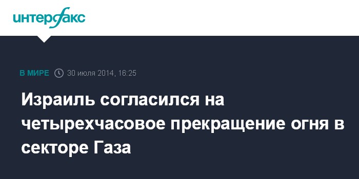 Москва. 30 июля. INTERFAX.RU - Власти Израиля согласились на четырехчасовое гуманитарное перемирие в секторе Газа, говорится в заявлении Армии обороны Израиля, опубликованном в среду.