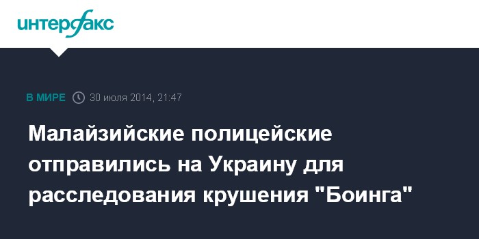 Москва. 30 июля. INTERFAX.RU - В среду 68 малайзийских полицейских отправились на Украину для участия в работе международной экспертной группы по расследованию обстоятельств крушения пассажирского самолета Malaysia Airlines.