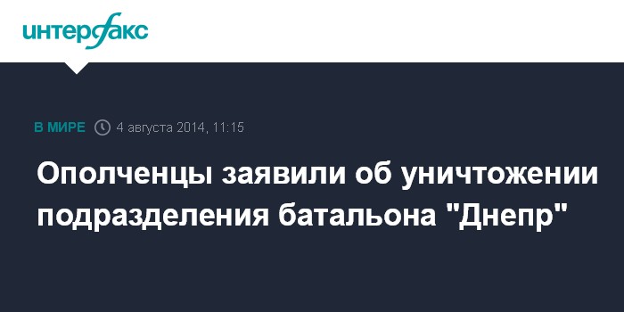 Москва. 4 августа. INTERFAX.RU - Ополченцы самопровозглашенной Донецкой народной республики заявляют о ликвидации одного из подразделений украинского батальона "Днепр", сообщает агентство "Новороссия" в понедельник.